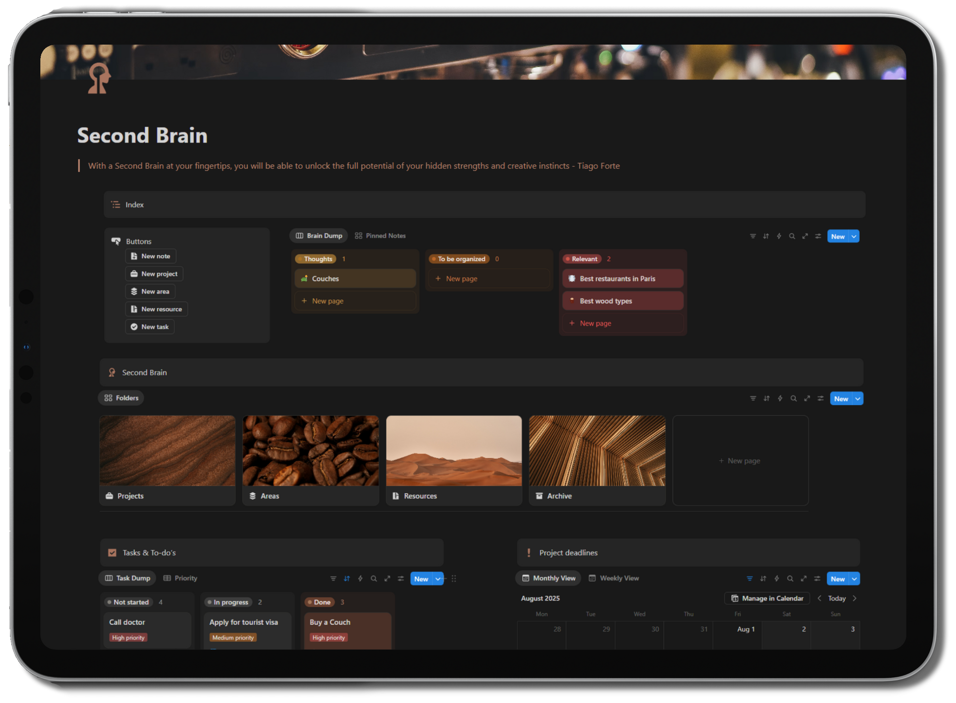 Structure your thoughts, manage your projects, and store your knowledge in one elegant and easy to use Notion template. Inspired by the PARA method from Tiago Forte’s book, this template is designed to help you unlock your second brain and unlock your full potential.