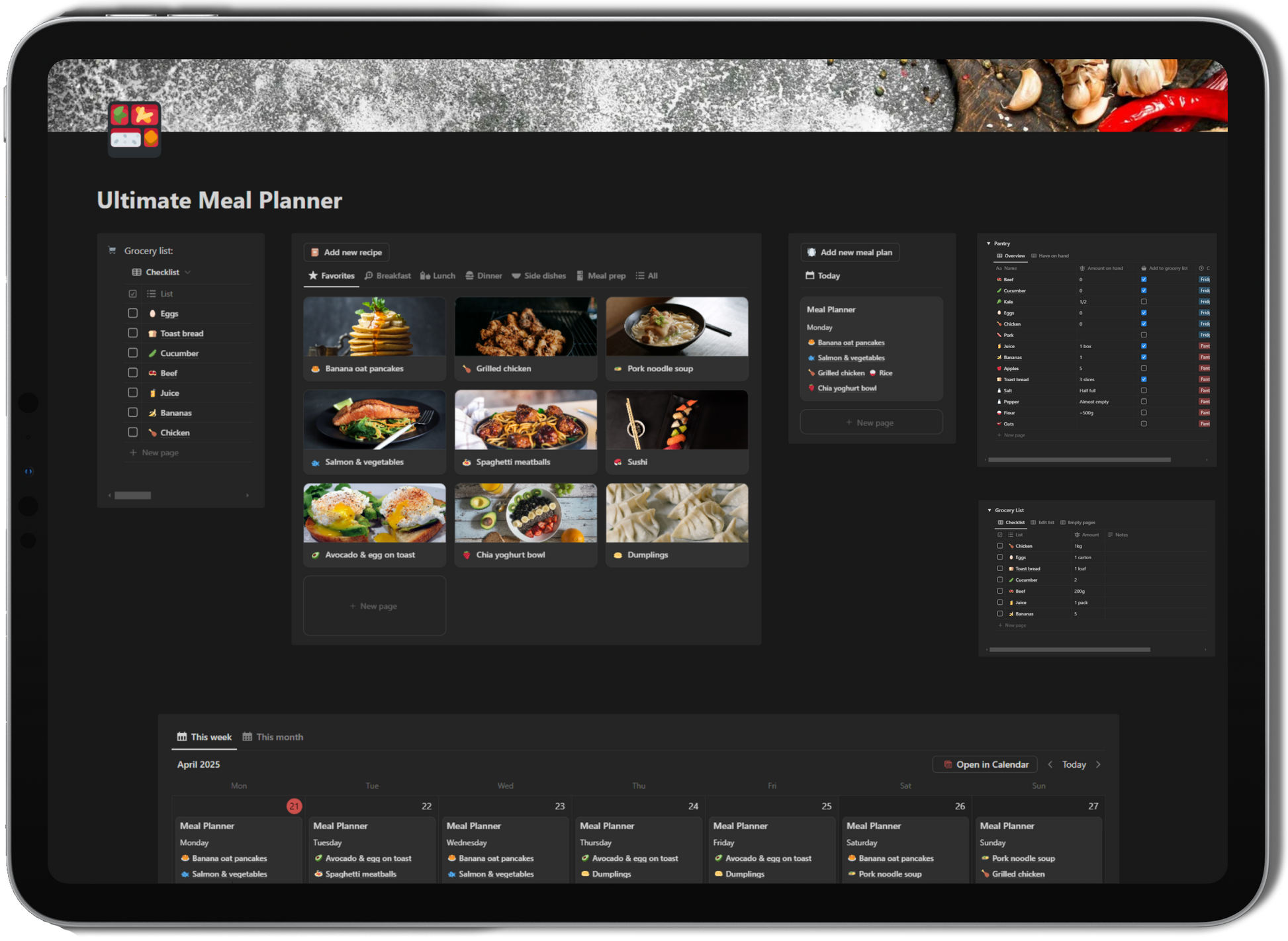 Plan your meals, organise your recipes, and streamline your grocery shopping with this all-in-one Notion meal planner. Thoughtfully designed for simplicity and efficiency, this template helps you stay on top of your kitchen routine with smart syncing, intuitive layouts, and everything you need in one connected space.